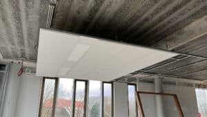 Ook zijn de installaties op het dak geplaatst zoals de luchtbehandelingskasten en warmtepompen. En is er alvast een proefopstelling gemaakt voor het plafond en tegelwerk in de toiletten.